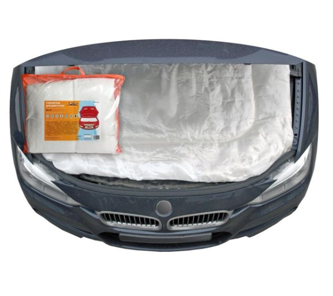 - Более быстрый прогрев автомобильного двигателя. Изделие из стекловаты, каолиновой ваты или другой волокнистой ткани цепляется в моторном отсеке непосредственно на силовой агрегат и представляет собой тепловой экран. Свойства изделия для утепления не позволяют теплому воздушному потоку покидать подкапотное пространство, уходя вверх, а направляет его вниз. Это способствует его сохранению и предотвращает быстрое остывание силового агрегата.